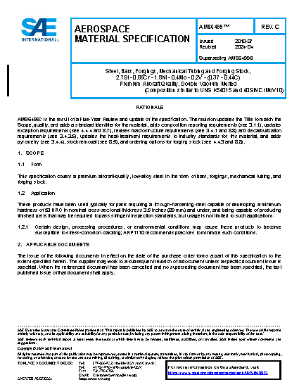 This specification covers a premium aircraft-quality, low-alloy steel in the form of bars, forgings, mechanical tubing, and forging stock.
