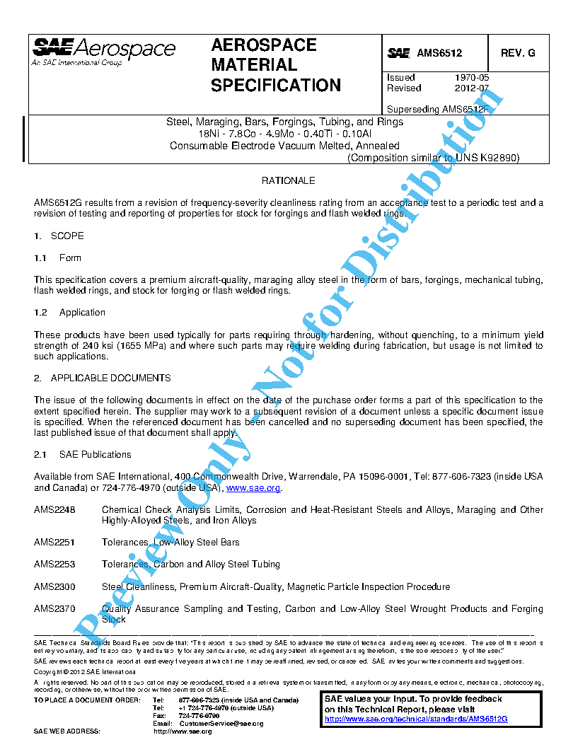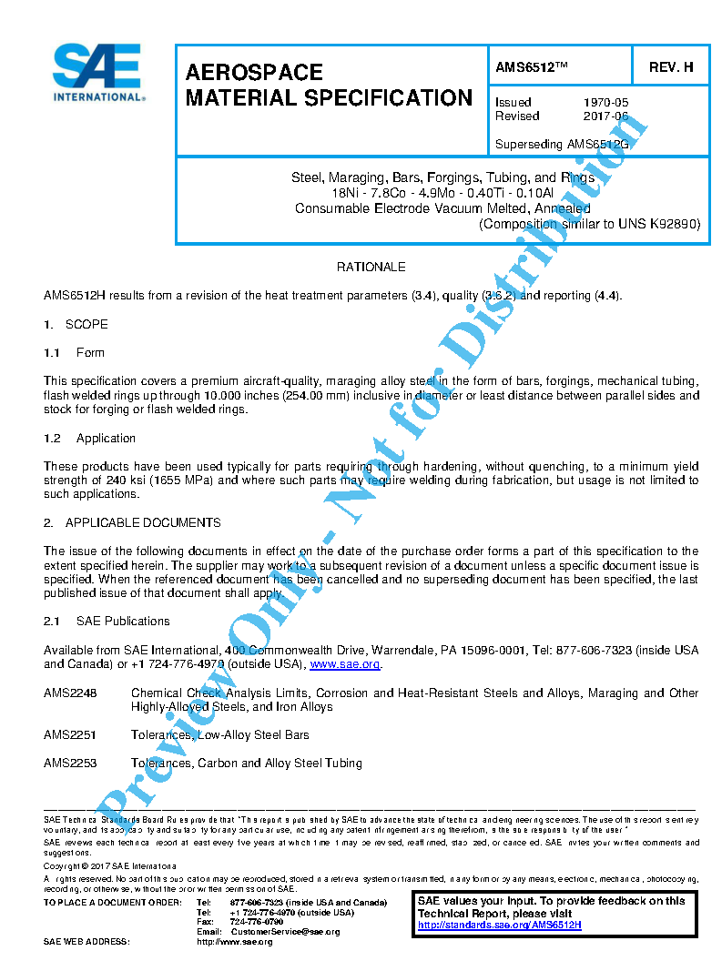 This specification covers a premium aircraft-quality, maraging alloy steel in the form of bars, forgings, mechanical tubing, flash welded rings up through 10.000 inches (254.00 mm) inclusive in diameter or least distance between parallel sides and stock for forging or flash welded rings.