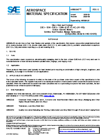 This specification covers a premium aircraft-quality maraging steel in the form of bars 0.50 inch (12.7 mm) and over in nominal diameter or least distance between parallel sides, forgings, and forging stock.