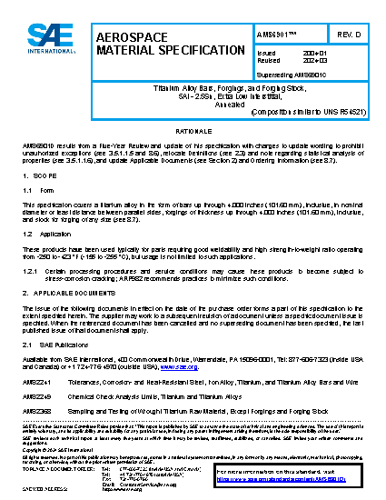 Titanium Alloy Bars, Forgings, and Forging Stock 5Al - 2.5Sn, Extra Low Interstitial Annealed