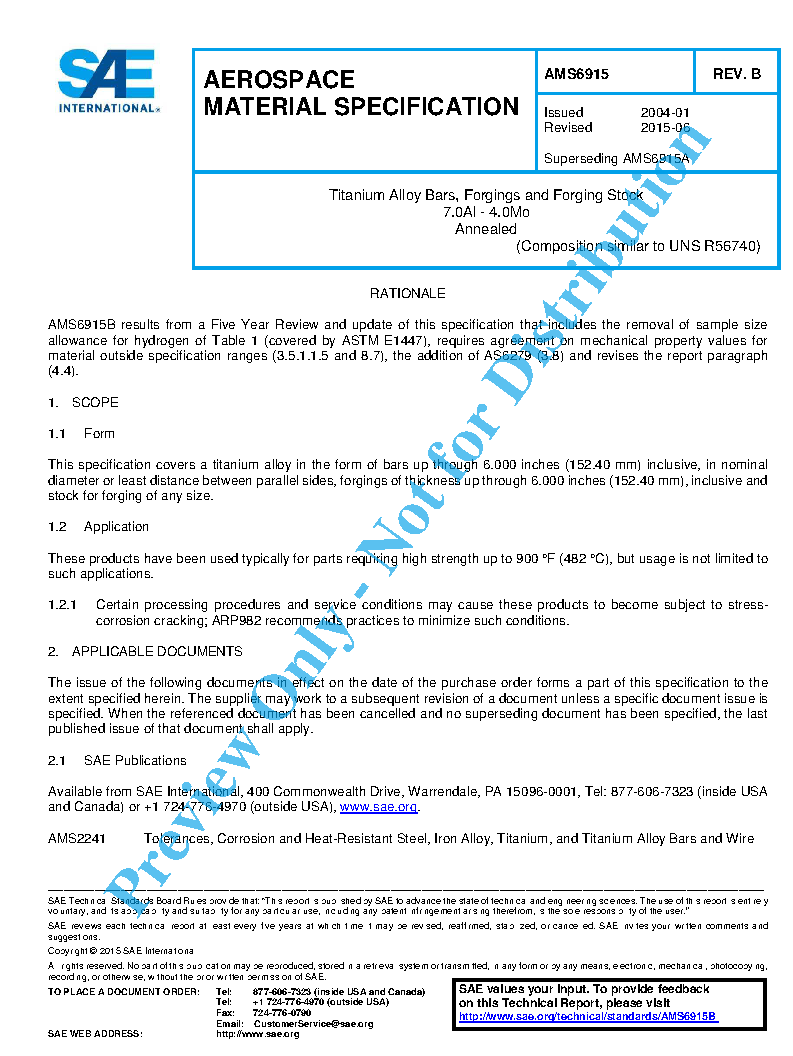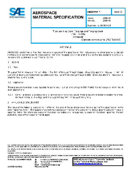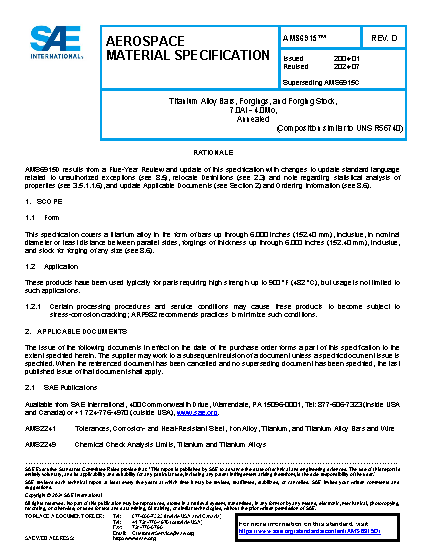 This specification covers a titanium alloy in the form of bars up through 6.000 inches (152.40 mm) inclusive, in nominal diameter or least distance between parallel sides, forgings of thickness up through 6.000 inches (152.40 mm), inclusive and stock for forging of any size.