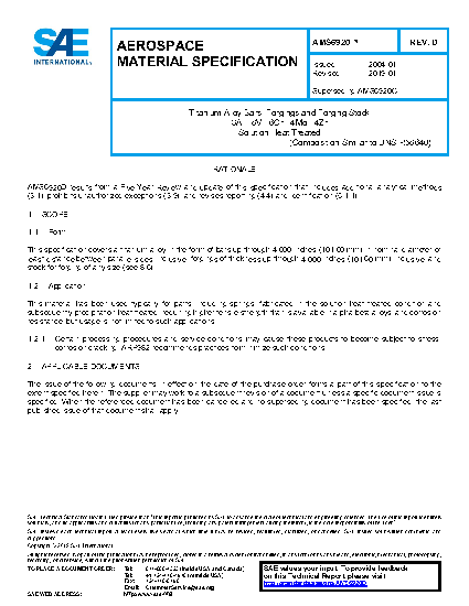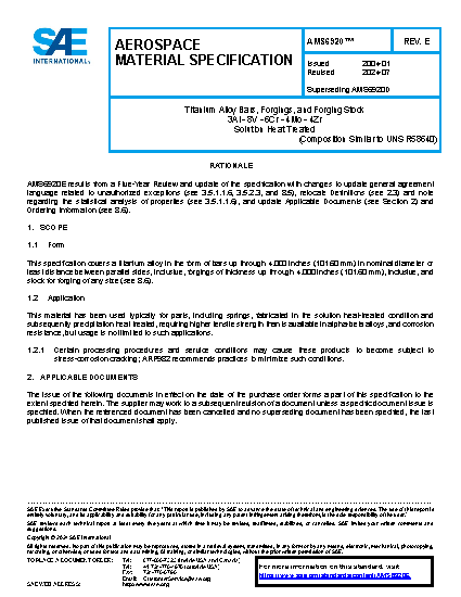 This specification covers a titanium alloy in the form of bars up through 4.000 inches (101.60 mm) in nominal diameter or least distance between parallel sides, inclusive, forgings of thickness up through 4.000 inches (101.60 mm), inclusive, and stock for forging of any size (see 8.6).