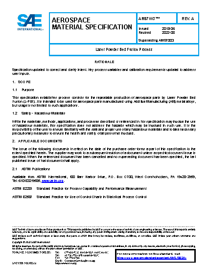 This specification establishes process controls for the repeatable production of aerospace parts by Laser Powder Bed Fusion (L-PBF). It is intended to be used for aerospace parts manufactured using Additive Manufacturing (AM) metal alloys, but usage is not limited to such applications.