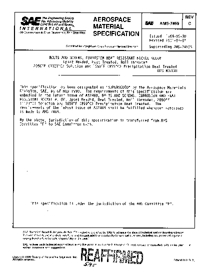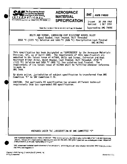 BOLTS AND SCREWS, CORROSION HEAT RESISTANT NICKEL ALLOY Upset Headed, Heat Treated, Roll Threaded 2050°F (1121°C) Solution and 1650°F (899°C) Precipitation Heat Treated