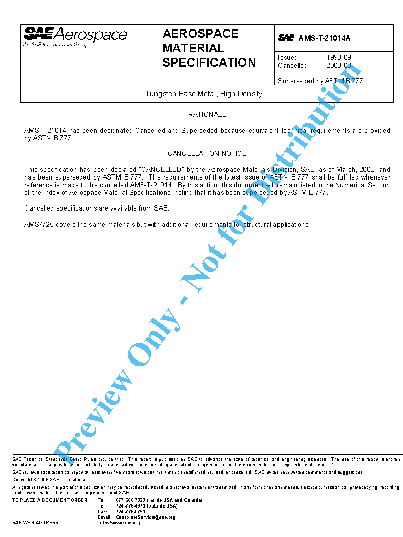 This specification covers the requirements for four classes of machinable, high density tungsten base metal produced by consolidation of metal powder mixtures whose composition is mainly tungsten. This material may be used for uncoated parts or parts that may be coated with other materials for protection against corrosion and abrasion such as, electrodeposited and vacuum deposited cadmium and electrodeposited chromium. Detailed requirements for coatings should be covered in the applicable part drawing, when required.