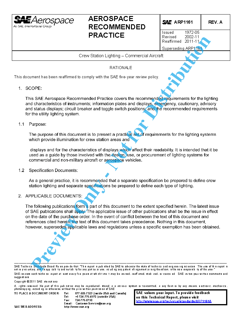 This SAE Aerospace Recommended Practice covers the recommended requirements for the lighting and characteristics of instruments; information plates and displays, emergency, cautionary, advisory and status displays; circuit breaker and toggle switch positions; and the recommended requirements for the utility lighting system.
