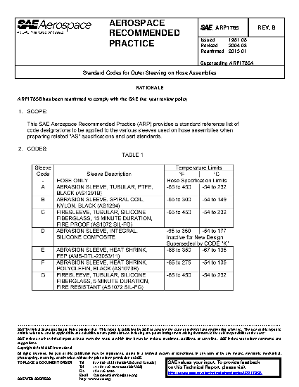 This SAE Aerospace Recommended Practice (ARP) provides a standard reference list of code designations to be applied to the various sleeves used on hose assemblies when preparing related "AS" specifications and part standards.