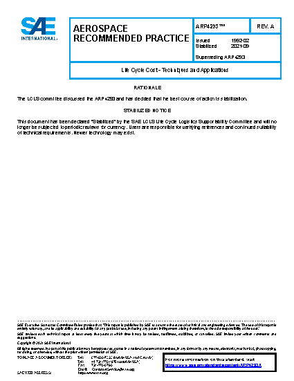 This SAE Aerospace Recommended Practice (ARP) describes the concept of life cycle costing with emphasis on LCC techniques and applications as applied to the phases of the program cycle. These phases are: