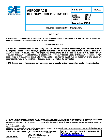 This recommended practice provides guidelines for the establishment of an induction hardening process for steel components. It is intended to be used as a guide for designers of induction hardened parts, for process auditors, and for purchase specifications and/or process sheets as applicable.