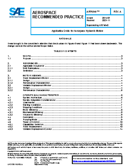 This SAE Aerospace Recommended Practice (ARP) is an application guide for fixed and variable displacement hydraulic motors. It provides details of the characteristics of fixed and variable displacement hydraulic motors, architectures, circuit designs, controls, and typical applications. The applications include airborne and defense vehicles with emphasis on high performance applications.