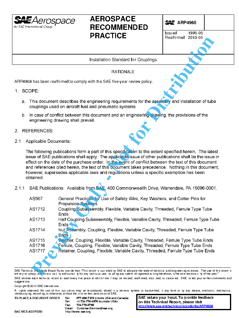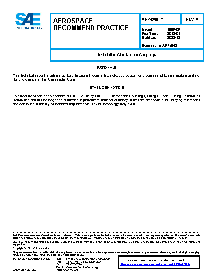 This document describes the engineering requirements for the assembly and installation of tube couplings used on aircraft fuel and pneumatic systems. In case of conflict between this document and an engineering drawing, the provisions of the engineering drawing shall prevail.
