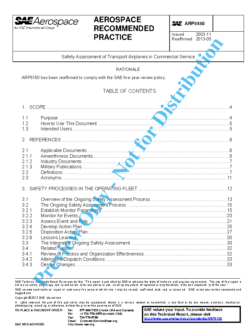 This document describes guidelines, methods and tools used to perform the ongoing safety assessment process for transport airplanes in commercial service (hereafter, airplane). The process described herein is intended to support an overall safety management program. It is associated with showing compliance with the regulations, and also with assuring a company that it meets its own internal standards. The methods outlined herein identify a systematic means, but not the only means, to assess ongoing safety.