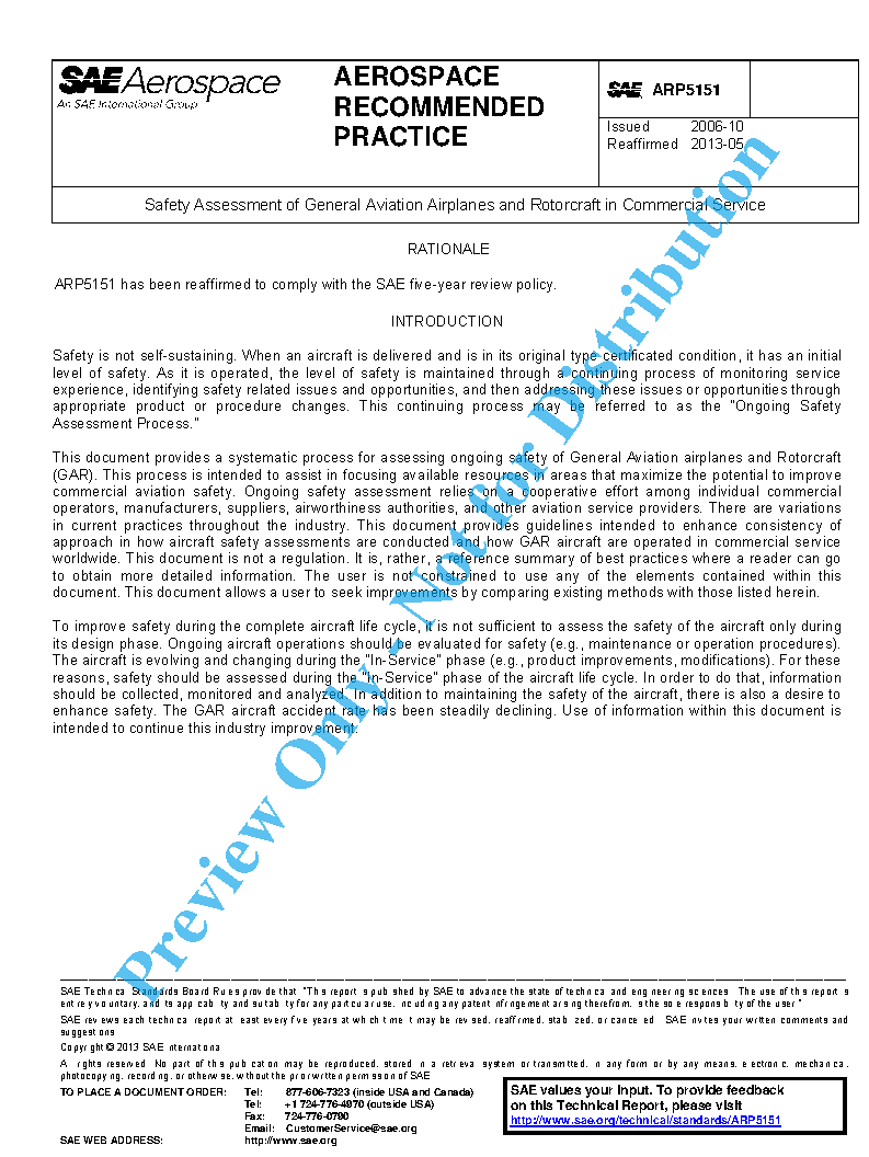 ARP5150 is the standard for the safety assessment of Transport Airplanes in Commercial Service. ARP5151 specifies the safety assessment process for GAR aircraft in Commercial Services. While the processes are similar, their implementations are different due to operations, data availability, and sizes of individual operations.