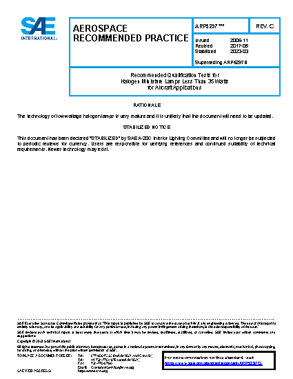 This SAE Aerospace Recommended Practice (ARP) provides the qualification test procedure requirements for low wattage halogen lamps (less than 35 watts) intended for use primarily in aircraft applications. The purpose of these tests is to provide a laboratory means of determining the performance characteristics of lamps under airplane power and other environmental conditions and to verify the integrity of the lamp design and production processes.