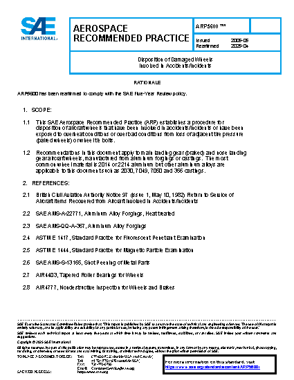 This SAE Aerospace Recommended Practice (ARP) establishes a procedure for disposition of aircraft wheels that have been involved in accidents/incidents or have been exposed to overheat conditions or overload conditions from loss of adjacent tire pressure (paired wheels) or wheel tie bolts.
