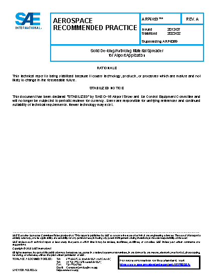 This equipment recommended practice defines the requirements for a permanent vehicle-mounted or slip-in accessory device designed to transport and distribute aggregate de-icing, anti-icing, or friction modifying solid materials or wetted solid materials onto runways, taxiways, ramp, and terminal areas and other paved surfaces on an airport. It is not intended for liquid material spreaders which are addressed in ARP5559. The material spreader may be permanently mounted on a carrier vehicle, trailer, or semi-trailer, or temporarily installed on a carrier vehicle trailer, or semi-trailer for seasonal use only. The carrier vehicle may be dedicated to material spreading applications only, or provide additional functions such as a plow vehicle, flat bed or dump body. Carrier vehicles are self-propelled prime movers, generally a commercial or purpose-built truck that provides the mobility to move the material spreader on these paved surfaces. Carrier vehicle recommended practices may be found in ARP5943 plows and ARP5539, rotary plow with carrier vehicle. This recommended practice does not include requirements for the carrier vehicle, snow plow or other applications for the carrier vehicle.