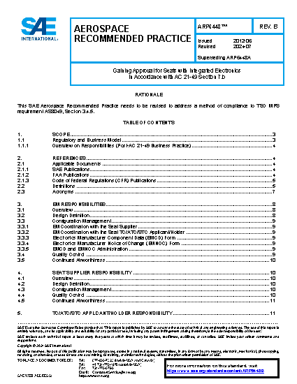 The document defines the roles and responsibilities of each party involved in the procurement of electronics, their integration on a TSO-approved seat, and the seat’s installation on an aircraft. Requirements for design and quality control and the methods for communicating design and change data between electronics manufacturers (EM) and seat suppliers are defined such that standardization is possible across the industry to ensure continued airworthiness of TSO-approved seats with integrated electronic components. This document primarily focuses on correspondence between the seat supplier and the electronics manufacturer.