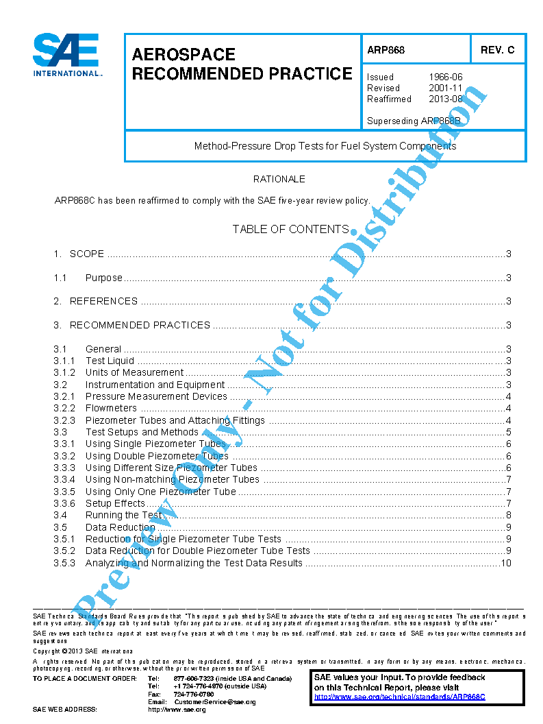 This document provides recommended methods and describes associated equipment and test setups to assist in understanding and conducting pressure drop tests on fuel system components. Background information and suggestions are provided as means of improving accuracy and repeatability of test results. Although written specifically for fuel system components, the methods, equipment and suggestions presented herein apply equally to pressure drop tests of other liquid-handling devices.