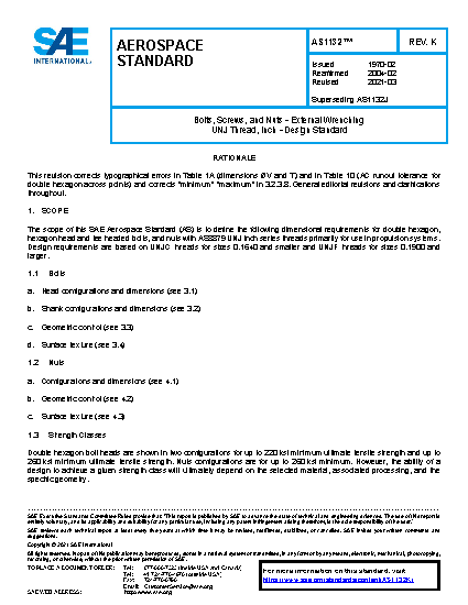 The scope of this SAE Aerospace Standard (AS) is to define the following dimensional requirements for double hexagon, hexagon head and tee headed bolts, and nuts with AS8879 UNJ inch series threads primarily for use in propulsion systems. Design requirements are based on UNJC threads for sizes 0.1640 and smaller and UNJF threads for sizes 0.1900 and larger.