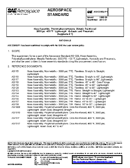 This supplement forms a part of the Aerospace Standard AS1339, Hose Assembly, Polytetrafluoroethylene, Metallic Reinforced, 3000 PSI, 400 °F, Lightweight, Hydraulic and Pneumatic, and shall be used to identify hose assembly standards citing this procurement specification.