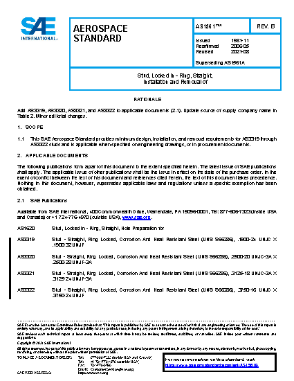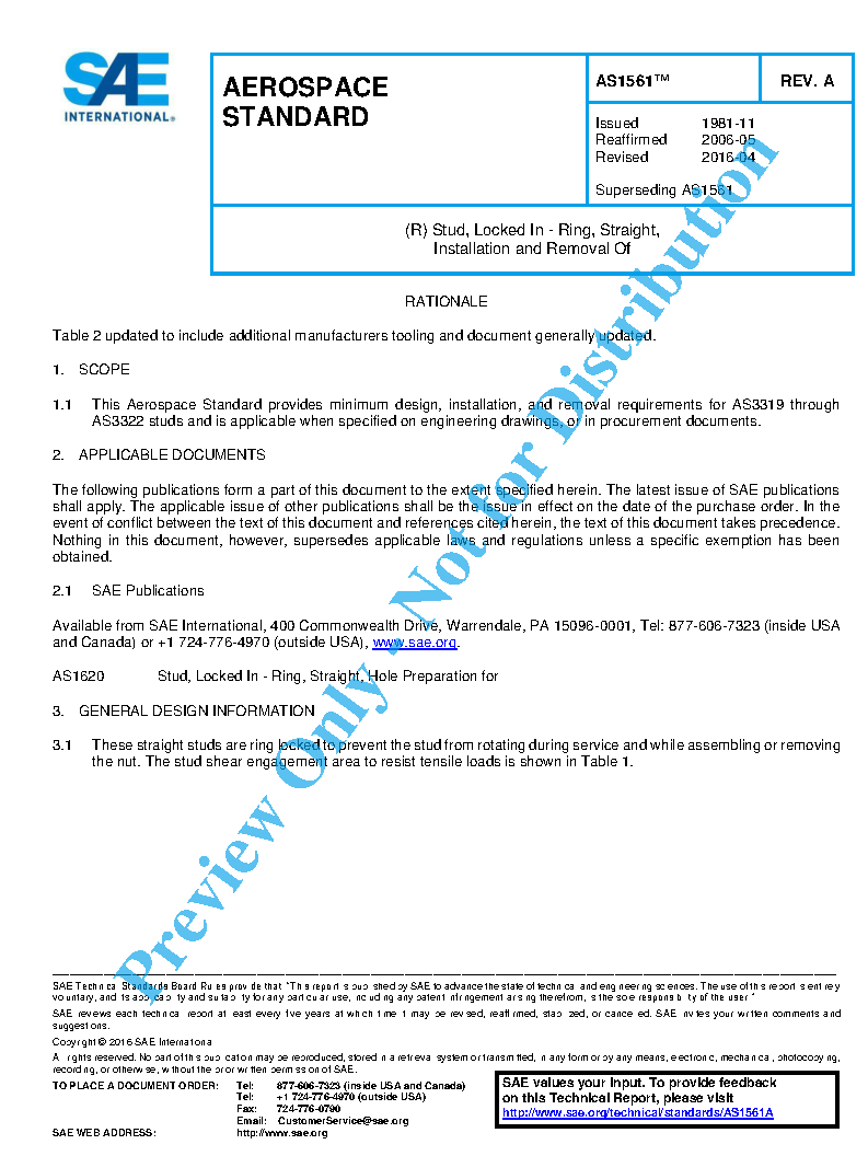 This Aerospace Standard provides minimum design, installation, and removal requirements for AS3319 through AS3322 studs and is applicable when specified on engineering drawings, or in procurement documents.
