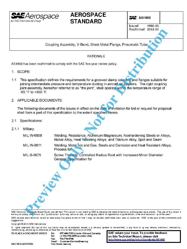 This specification defines the requirements for a grooved clamp coupling and flanges suitable for joining intermediate pressure and temperature ducting in aircraft air systems. The rigid coupling joint assembly, hereafter referred to as "the joint", shall operate within the temperature range of -65 °F to +800 °F.