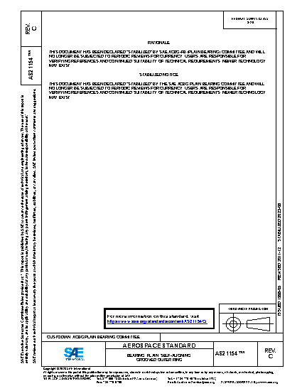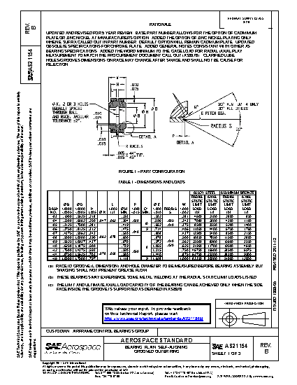 UPDATED AND REVISED FOR 5 YEAR REVIEW. BASE PART NUMBER ALLOWS FOR THE OPTION OF CADMIMUM PLATE OR ZINC NICKEL AT MANUFACTURERS OPTION. ADDED THE OPTION OF ZINC NICKEL PLATING ONLY WHEN E SUFFIX CALLED OUT IN PART NUMBER. DEFAULT OPTION WILL REMAIN CADMIUM PLATE. UPDATED OBSOLETE SPECIFICATIONS FOR CHROME PLATE. ADDED GENERAL NOTES CONSISTANT WITH OTHER AS BEARING SPECIFICATIONS. ADDED THE WORD MINIMUM TO THE GAGE LOAD FOR RADIAL /AXIAL PLAY MEASUREMENT TO MATCH THE PROCUREMENT DOCUMENT CALL OUT (AS8976). CLARIFIED LUBE HOLES/GROOVES DIMENSIONS ON RACE MAY CHANGE AFTER SWAGE AND SHALL NOT BE CAUSE FOR REJECTION.