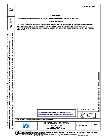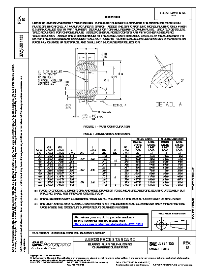 UPDATED AND REVISED FOR 5 YEAR REVIEW. BASE PART NUMBER ALLOWS FOR THE OPTION OF CADMIMUM PLATE OR ZINC NICKEL AT MANUFACTURER’S OPTION. ADDED THE OPTION OF ZINC NICKEL PLATING ONLY WHEN E SUFFIX CALLED OUT IN PART NUMBER. DEFAULT OPTION WILL REMAIN CADMIUM PLATE. UPDATED OBSOLETE SPECIFICATIONS FOR CHROME PLATE. ADDED GENERAL NOTES CONSISTANT WITH OTHER AS BEARING SPECIFICATIONS. ADDED THE WORD MINIMUM TO THE GAGE LOAD FOR RADIAL /AXIAL PLAY MEASUREMENT TO MATCH THE PROCUREMENT DOCUMENT CALL OUT (AS8976). CLARIFIED LUBE HOLES/GROOVES DIMENSIONS ON RACE MAY CHANGE AFTER SWAGE AND SHALL NOT BE CAUSE FOR REJECTION.