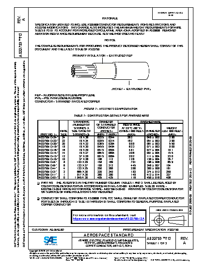SPECIFICATION UPDATED TO INCLUDE AS29606 CONDUCTOR REQUIREMENTS, ROHS RESTRICTIONS AND AS22759 MODIFICATIONS. THIS CHANGE ALSO INCREASES THE MAXIMUM WEIGHT REQUIREMENTS FOR WIRE SIZES 8 TO 01 TO ACCOUNT FOR INCREASED CIRCULAR MIL AREA (CMA) ADOPTED IN AS29606. REMOVED ABRASION RESISTANCE REQUIREMENT BECAUSE TEST METHOD DOES NOT EXIST.