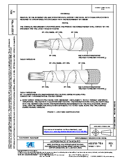 SPECIFICATION UPDATED TO INCLUDE AS29606 CONDUCTOR REQUIREMENTS, ROHS RESTRICTIONS AND AS22759 MODIFICATIONS. THIS CHANGE ALSO INCREASES THE MAXIMUM WEIGHT REQUIREMENTS FOR WIRE SIZES 8 THROUGH 02 TO ACCOUNT FOR INCREASED CIRCULAR MIL AREA (CMA) ADOPTED IN AS29606. AS22759 IS A CONVERTED MILITARY SPECIFICATION ORIGINALLY NOTED AS MIL-W-22759 CREATED IN 1971. CONDUCTOR REQUIREMENTS WERE ORIGINALLY DEFINED BY ASTM B3, B298 AND B355 FOR TIN, SILVER AND NICKEL PLATE RESPECTIVELY. THESE SPECIFICATIONS CONTROLLED THE CONDUCTOR BY ESTABLISHING STRAND SIZE, CONDUCTOR SIZE AND MAXIMUM DCR (DIRECT CURRENT RESISTANCE). BY THE LATE 1980'S CONDUCTOR PRODUCERS WERE PRODUCING TIGHT TOLERANCE CONDUCTORS WHICH WERE MADE AT THE MINIMUM DIMENSIONAL AND MAXIMUM DCR LIMITS OF THE SPECIFICATION TO REDUCE THE WEIGHT (MASS) OF THE FINALLY INSULATED WIRE. BY THE EARLY 1990'S THE TIGHT TOLERANCE CONDUCTORS WERE PREVALENT THROUGHOUT AEROSPACE. ABOUT THE SAME TIME, LARGE GAUGE SIZE CONDUCTORS (SIZE 8 THROUGH 4/0) STARTED EXHIBITING CRIMP FAILURES IN TERMINAL LUGS MOUNTED ON AIRCRAFT GENERATORS. SINCE THESE CIRCUITS ROUTED PRIMARY ELECTRICAL POWER FROM THE GENERATOR TO THE MAIN POWER DISTRIBUTION CENTERS, CRIMP DEGRADATION RESULTING IN DISRUPTION OF ELECTRICAL POWER CAUSED SIGNIFICANT CONCERN. SEVERAL OEM'S AS WELL AS NAVY AND AIR FORCE LABORATORIES INVESTIGATED THE FAILURES AND DETERMINED THAT THE FAILED CRIMPS WERE DUE TO A COMBINATION OF LOW CMA, HIGH VIBRATION AND THERMAL CYCLING. ADDITIONAL TESTING ESTABLISHED MINIMUM CMA LEVELS WHICH WOULD PREVENT THE CRIMP FAILURES. THESE NEW LIMITS WERE OFFERED TO ASTM BUT REJECTED. NAVAIR THEN PRODUCED AN ENGINEERING POSITION LETTER (EPL) TO MANDATE THE INCREASED CMAS ON STRANDING USED IN AS22759 CONSTRUCTIONS. NAVAIR THEN CREATED MIL-W-29606 WHICH WAS INTENDED TO REPLACE THE ASTM SPECIFICATIONS AS THE REQUIRED CONDUCTOR SPECIFICATION. BEFORE THE MIL-W-29606 COULD BE ADDED TO MIL-W-22759, THE SPECIFICATION TRANSITION AND ADOPTION TOOK PLACE CONVERTING THE DOCUMENTS FROM MILITARY SPECIFICATIONS TO AS DOCUMENTS IN THE 1999 - 2000 TIME FRAME. SINCE THE EPL NO LONGER HAD LEGAL STANDING AFTER THE CONVERSION, WIRE PRODUCERS DID NOT HAVE TO ABIDE BY THE RESTRICTIONS WHICH ALLOWED THIS ISSUE TO CREEP BACK INTO THE 'PRODUCTS FROM TIME TO TIME. IN 2011, THE SAE AE-8D COMMITTEE OPENED A PROJECT TO UPDATE THE AS22759 AND ITS ASSOCIATED DETAILED SPECIFICATION SHEETS. WHEN LOOKING AT THIS ISSUE, THE COMMITTEE DECIDED TO ADOPT MIL-W-29606 (NOW AS29606) AND REPLACE THE ASTM REQUIREMENTS WITH THE AS29606 REQUIREMENTS. SINCE THE DIAMETER RANGE OF THE CONDUCTOR STRANDS NEEDED TO SHIFT SLIGHTLY TO THE RIGHT TO MEET THE NEW MINIMUM CMA REQUIREMENTS, OVERALL PRODUCT WEIGHT MAXIMUMS SHIFTED ABOUT 3 TO 5 PERCENT. THE COMMITTEE EVALUATED SEVERAL METHODS OF INCORPORATING THIS CHANGE INCLUDING CANCELING AND SUPERSESSION, BUT THE END USERS DID NOT WANT TO CHANGE PART NUMBERS FOR PRODUCTS WHICH HAVE BEEN USED IN AEROSPACE AND INDUSTRY FOR OVER 40 YEARS AND IS CURRENTLY ON THOUSANDS OF DRAWINGS. SINCE THESE PRODUCTS ARE PRIMARILY USED FOR PRIMARY POWER DISTRIBUTION FROM THE GENERATORS TO THE MAIN DISTRIBUTION PANELS, THE WEIGHT INCREASE TO THE ELECTRICAL INTERCONNECT SYSTEM IS CONSIDERED INSIGNIFICANT. SINCE THIS CHANGE DOES AFFECT THE MAXIMUM WEIGHT LIMITS FOR SIZES 8 THROUGH 4/0, END USERS SHOULD VERIFY THAT THE NEW WEIGHT RANGES MEET THE DESIGN REQUIREMENTS OF LEGACY APPLICATIONS.