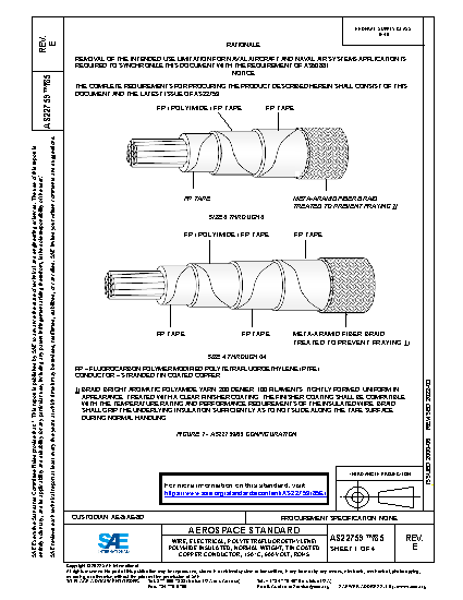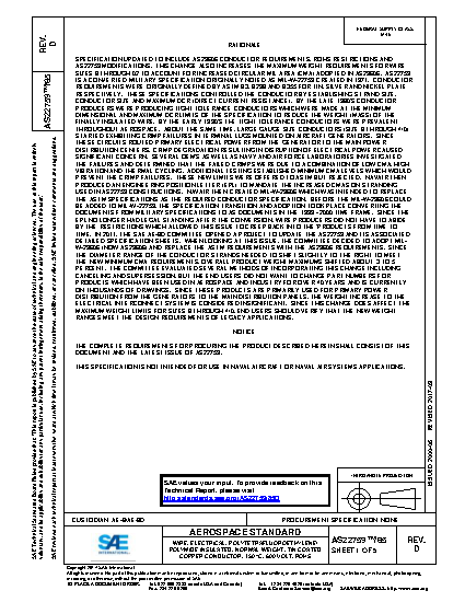 SPECIFICATION UPDATED TO INCLUDE AS29606 CONDUCTOR REQUIREMENTS, ROHS RESTRICTIONS AND AS22759 MODIFICATIONS. THIS CHANGE ALSO INCREASES THE MAXIMUM WEIGHT REQUIREMENTS FOR WIRE SIZES 8 THROUGH 02 TO ACCOUNT FOR INCREASED CIRCULAR MIL AREA (CMA) ADOPTED IN AS29606. AS22759 IS A CONVERTED MILITARY SPECIFICATION ORIGINALLY NOTED AS MIL-W-22759 CREATED IN 1971. CONDUCTOR REQUIREMENTS WERE ORIGINALLY DEFINED BY ASTM B3, B298 AND B355 FOR TIN, SILVER AND NICKEL PLATE RESPECTIVELY. THESE SPECIFICATIONS CONTROLLED THE CONDUCTOR BY ESTABLISHING STRAND SIZE, CONDUCTOR SIZE AND MAXIMUM DCR (DIRECT CURRENT RESISTANCE). BY THE LATE 1980'S CONDUCTOR PRODUCERS WERE PRODUCING TIGHT TOLERANCE CONDUCTORS WHICH WERE MADE AT THE MINIMUM DIMENSIONAL AND MAXIMUM DCR LIMITS OF THE SPECIFICATION TO REDUCE THE WEIGHT (MASS) OF THE FINALLY INSULATED WIRE. BY THE EARLY 1990'S THE TIGHT TOLERANCE CONDUCTORS WERE PREVALENT THROUGHOUT AEROSPACE. ABOUT THE SAME TIME, LARGE GAUGE SIZE CONDUCTORS (SIZE 8 THROUGH 4/0) STARTED EXHIBITING CRIMP FAILURES IN TERMINAL LUGS MOUNTED ON AIRCRAFT GENERATORS. SINCE THESE CIRCUITS ROUTED PRIMARY ELECTRICAL POWER FROM THE GENERATOR TO THE MAIN POWER DISTRIBUTION CENTERS, CRIMP DEGRADATION RESULTING IN DISRUPTION OF ELECTRICAL POWER CAUSED SIGNIFICANT CONCERN. SEVERAL OEM'S AS WELL AS NAVY AND AIR FORCE LABORATORIES INVESTIGATED THE FAILURES AND DETERMINED THAT THE FAILED CRIMPS WERE DUE TO A COMBINATION OF LOW CMA, HIGH VIBRATION AND THERMAL CYCLING. ADDITIONAL TESTING ESTABLISHED MINIMUM CMA LEVELS WHICH WOULD PREVENT THE CRIMP FAILURES. THESE NEW LIMITS WERE OFFERED TO ASTM BUT REJECTED. NAVAIR THEN PRODUCED AN ENGINEERING POSITION LETTER (EPL) TO MANDATE THE INCREASED CMAS ON STRANDING USED IN AS22759 CONSTRUCTIONS. NAVAIR THEN CREATED MIL-W-29606 WHICH WAS INTENDED TO REPLACE THE ASTM SPECIFICATIONS AS THE REQUIRED CONDUCTOR SPECIFICATION. BEFORE THE MIL-W-29606 COULD BE ADDED TO MIL-W-22759, THE SPECIFICATION TRANSITION AND ADOPTION TOOK PLACE CONVERTING THE DOCUMENTS FROM MILITARY SPECIFICATIONS TO AS DOCUMENTS IN THE 1999 - 2000 TIME FRAME. SINCE THE EPL NO LONGER HAD LEGAL STANDING AFTER THE CONVERSION, WIRE PRODUCERS DID NOT HAVE TO ABIDE BY THE RESTRICTIONS WHICH ALLOWED THIS ISSUE TO CREEP BACK INTO THE 'PRODUCTS FROM TIME TO TIME. IN 2011, THE SAE AE-8D COMMITTEE OPENED A PROJECT TO UPDATE THE AS22759 AND ITS ASSOCIATED DETAILED SPECIFICATION SHEETS. WHEN LOOKING AT THIS ISSUE, THE COMMITTEE DECIDED TO ADOPT MIL-W-29606 (NOW AS29606) AND REPLACE THE ASTM REQUIREMENTS WITH THE AS29606 REQUIREMENTS. SINCE THE DIAMETER RANGE OF THE CONDUCTOR STRANDS NEEDED TO SHIFT SLIGHTLY TO THE RIGHT TO MEET THE NEW MINIMUM CMA REQUIREMENTS, OVERALL PRODUCT WEIGHT MAXIMUMS SHIFTED ABOUT 3 TO 5 PERCENT. THE COMMITTEE EVALUATED SEVERAL METHODS OF INCORPORATING THIS CHANGE INCLUDING CANCELING AND SUPERSESSION, BUT THE END USERS DID NOT WANT TO CHANGE PART NUMBERS FOR PRODUCTS WHICH HAVE BEEN USED IN AEROSPACE AND INDUSTRY FOR OVER 40 YEARS AND IS CURRENTLY ON THOUSANDS OF DRAWINGS. SINCE THESE PRODUCTS ARE PRIMARILY USED FOR PRIMARY POWER DISTRIBUTION FROM THE GENERATORS TO THE MAIN DISTRIBUTION PANELS, THE WEIGHT INCREASE TO THE ELECTRICAL INTERCONNECT SYSTEM IS CONSIDERED INSIGNIFICANT. SINCE THIS CHANGE DOES AFFECT THE MAXIMUM WEIGHT LIMITS FOR SIZES 8 THROUGH 4/0, END USERS SHOULD VERIFY THAT THE NEW WEIGHT RANGES MEET THE DESIGN REQUIREMENTS OF LEGACY APPLICATIONS.