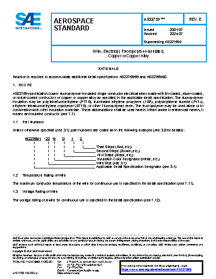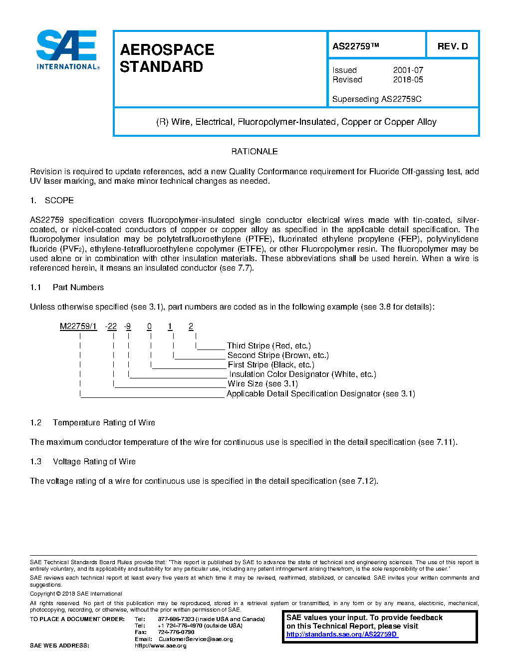 AS22759 specification covers fluoropolymer-insulated single conductor electrical wires made with tin-coated, silver-coated, or nickel-coated conductors of copper or copper alloy as specified in the applicable detail specification. The fluoropolymer insulation may be polytetrafluoroethylene (PTFE), fluorinated ethylene propylene (FEP), polyvinylidene fluoride (PVF2), ethylene-tetrafluoroethylene copolymer (ETFE), or other Fluoropolymer resin. The fluoropolymer may be used alone or in combination with other insulation materials. These abbreviations shall be used herein. When a wire is referenced herein, it means an insulated conductor (see 7.7).