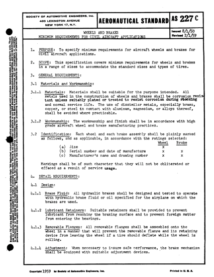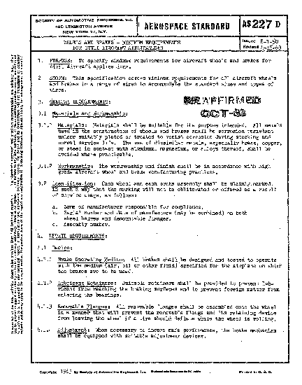 This specification covers minimum requirements for wheels and brakes in a range of sizes to accommodate the standard sizes and types of tires.