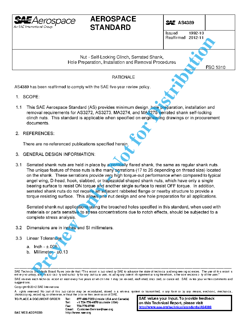 This SAE Aerospace Standard (AS) provides minimum design, hole preparation, installation and removal requirements for AS3272, AS3273, MA3274, and MA3275 serrated shank self-locking clinch nuts. This standard is applicable when specified on engineering drawings or in procurement documents.