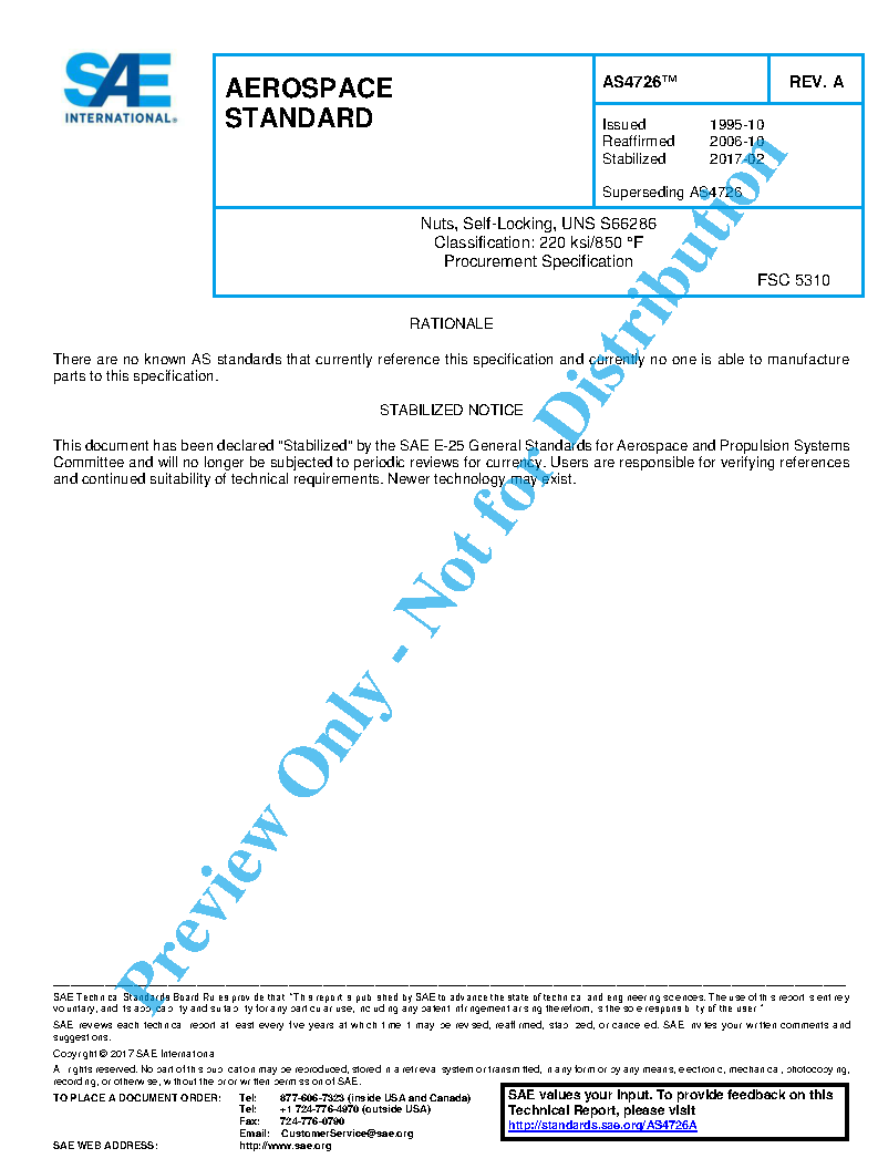 Nuts, Self-Locking, UNS S66286 Classification: 220 ksi/850 °F Procurement Specification (Stabilized: Feb 2017)