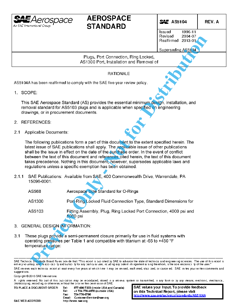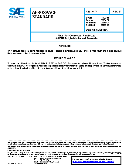 This SAE Aerospace Standard (AS) provides the essential minimum design, installation, and removal standard for AS5103 plugs and is applicable when specified on engineering drawing, or in procurement documents.