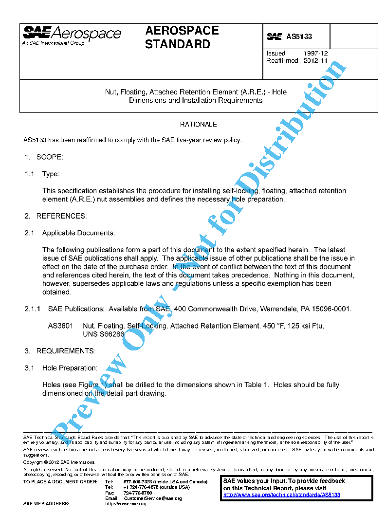This specification establishes the procedure for installing self-locking, floating, attached retention element (A.R.E.) nut assemblies and defines the necessary hole preparation.
