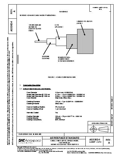 CABLE, FIBER OPTIC, SINGLE-MODE, 4.6/125/450 µm, HERMETIC COATED, TIGHT BUFFER