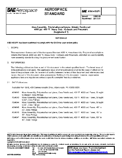 This supplement forms a part of the Aerospace Standard AS614, Hose Assembly, Polytetrafluoroethylene, Metallic Reinforced, 4000 psi, 400 °F, Heavy Duty, Hydraulic and Pneumatic, and shall be used to identify hose assembly standards citing this procurement specification.