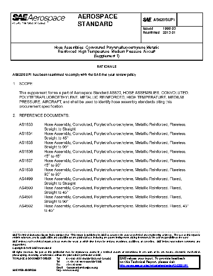 This supplement forms a part of Aerospace Standard AS620, HOSE ASSEMBLIES, CONVOLUTED, POLYTETRAFLUOROETHYLENE, METALLIC REINFORCED, HIGH TEMPERATURE, MEDIUM PRESSURE, AIRCRAFT, and shall be used to identify hose assembly standards citing this procurement specification.