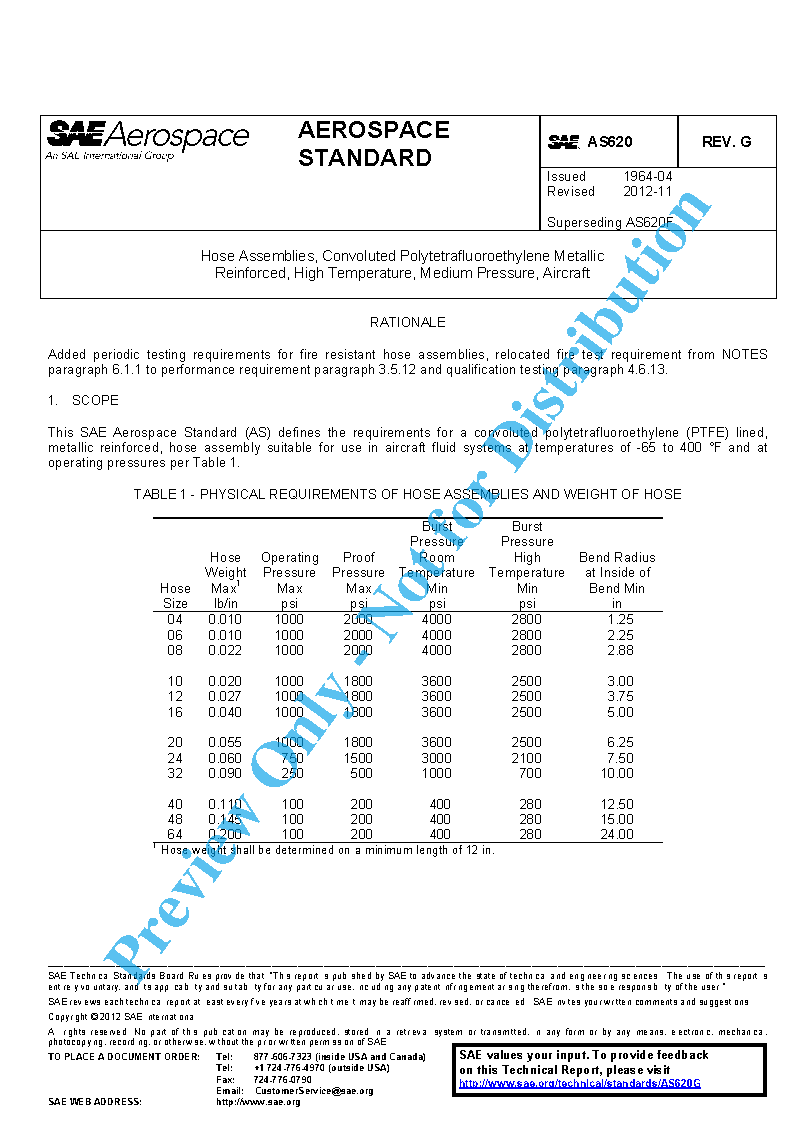 This SAE Aerospace Standard (AS) defines the requirements for a convoluted polytetrafluoroethylene (PTFE) lined, metallic reinforced, hose assembly suitable for use in aircraft fluid systems at temperatures of -65 to 400 °F and at operating pressures per Table 1.