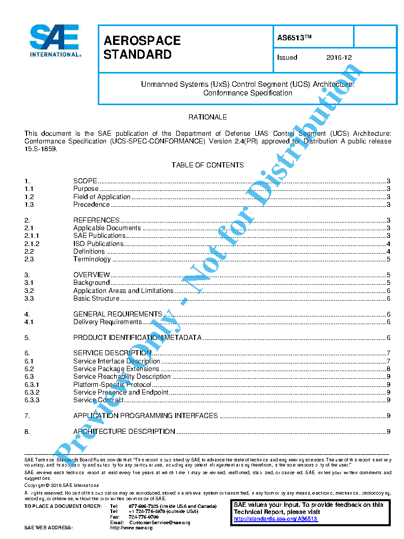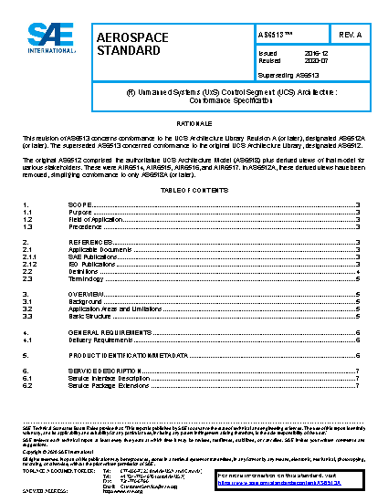 This document is the authoritative specification within the SAE Unmanned Systems (UxS) Control Segment (UCS) Architecture for establishing conformance requirements for UCS products. The UCS products addressed by this specification are UCS software components and UCS software configurations that provide one or more UCS services, and UCS systems that employ one or more UCS services.