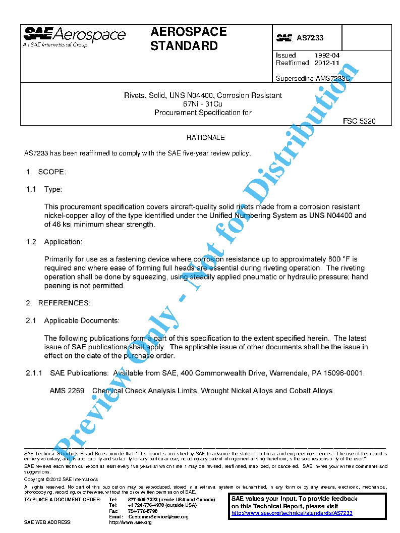 Rivets, Solid, UNS N04400, Corrosion Resistant 67Ni - 31Cu Procurement Specification for