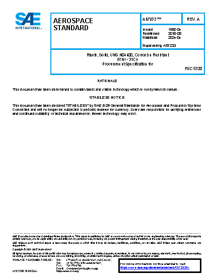 This procurement specification covers aircraft-quality solid rivets made from a corrosion resistant nickel-copper alloy of the type identified under the Unified Numbering System as UNS N04400 and of 46 ksi minimum shear strength.