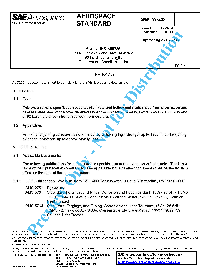 This procurement specification covers solid rivets and hollow end rivets made from a corrosion and heat resistant steel of the type identified under the Unified Numbering System as UNS S66286 and of 80 ksi single shear strength at room temperature.