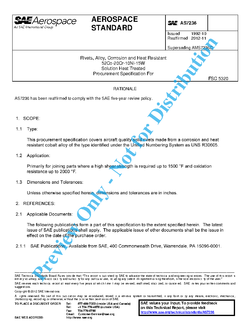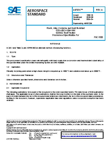 This procurement specification covers aircraft quality solid rivets made from a corrosion and heat resistant cobalt alloy of the type identified under the Unified Numbering System as UNS R30605.
