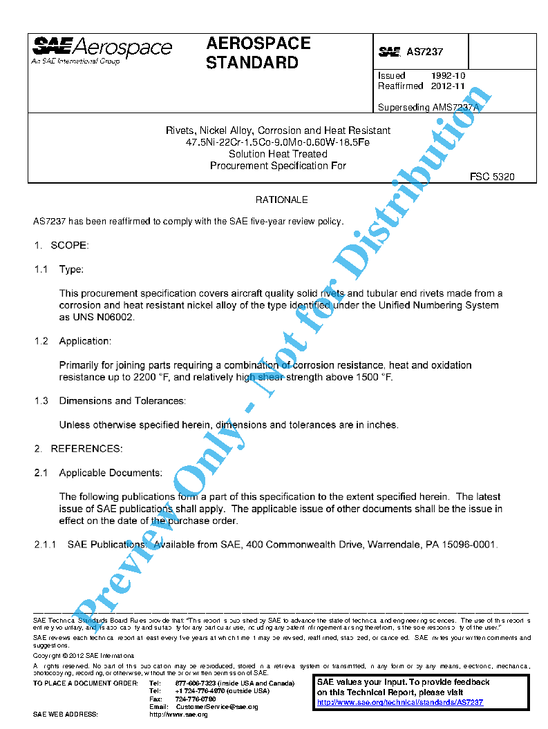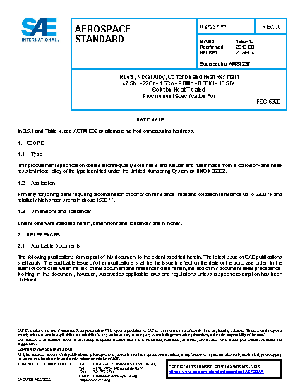 Rivets, Nickel Alloy, Corrosion and Heat Resistant 47.5Ni-22Cr-1.5Co-9.0Mo-0.60W-18.5Fe Solution Heat Treated Procurement Specification For