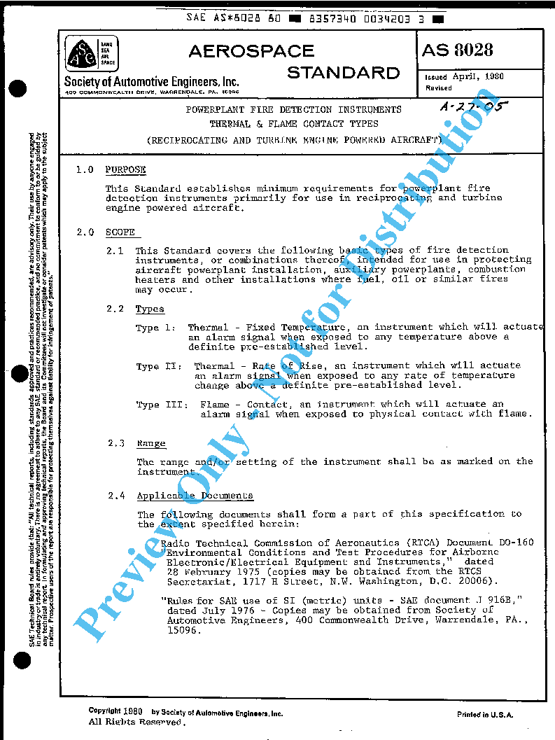 This Standard covers the following basic types of fire detection instruments, or combinations thereof, intended for use in protecting aircraft powerplant installation, auxiliary powerplants, combustion heaters and other installations where fuel, oil or similar fires may occur.