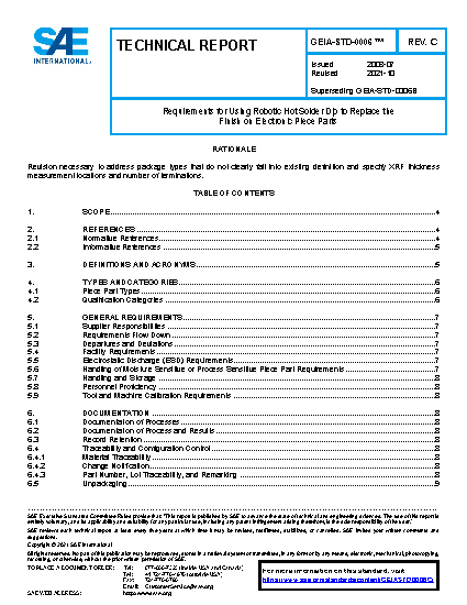 This standard defines the requirements for fully replacing undesirable surface finishes using robotic hot solder dip. Requirements for qualifying and testing the refinished piece parts are also included. This standard covers the replacement of pure tin and Pb-free tin alloy finishes with SnPb finishes with the intent of subsequent assembly with SnPb solder. This dipping is different from dipping to within some distance of the body for the purposes of solderability; solder dipping for purposes other than full replacement of pure tin and other Pb-free tin alloy finishes are beyond the scope of this document. It covers process and testing requirements for robotic dipping process and does not cover semi-automatic or purely manual dipping processes.