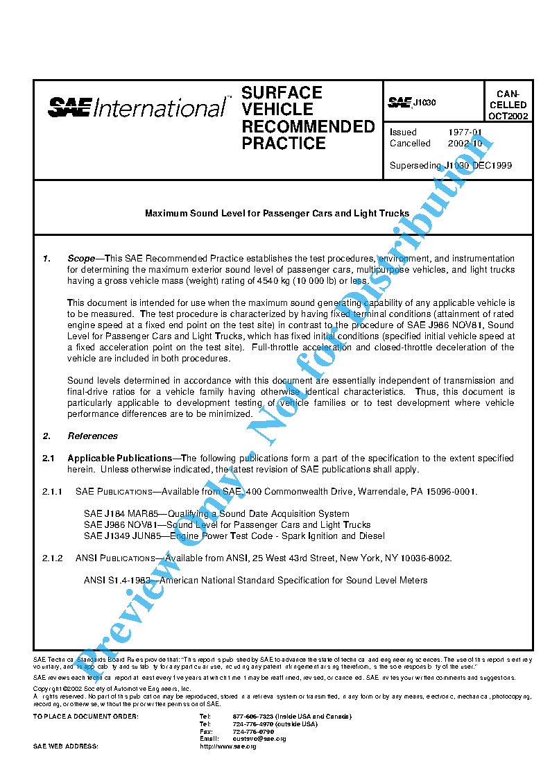This SAE Recommended Practice establishes the test procedures, environment, and instrumentation for determining the maximum exterior sound level of passenger cars, multipurpose vehicles, and light trucks having a gross vehicle mass (weight) rating of 4540 kg (10 000 lb) or less. This document is intended for use when the maximum sound generating capability of any applicable vehicle is to be measured. The test procedure is characterized by having fixed terminal conditions (attainment of rated engine speed at a fixed end point on the test site) in contrast to the procedure of SAE J986 NOV81, Sound Level for Passenger Cars and Light Trucks, which has fixed initial conditions (specified initial vehicle speed at a fixed acceleration point on the test site). Full-throttle acceleration and closed-throttle deceleration of the vehicle are included in both procedures. Sound levels determined in accordance with this document are essentially independent of transmission and final-drive ratios for a vehicle family having otherwise identical characteristics. Thus, this document is particularly applicable to development testing of vehicle families or to test development where vehicle performance differences are to be minimized.